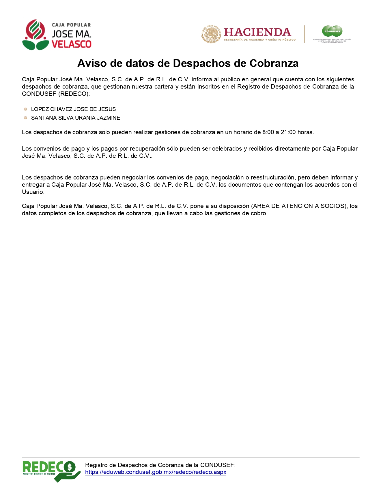 CAJA POPULAR JOSÉ MA. VELASCO S.C. DE A.P. DE R.L. DE C.V